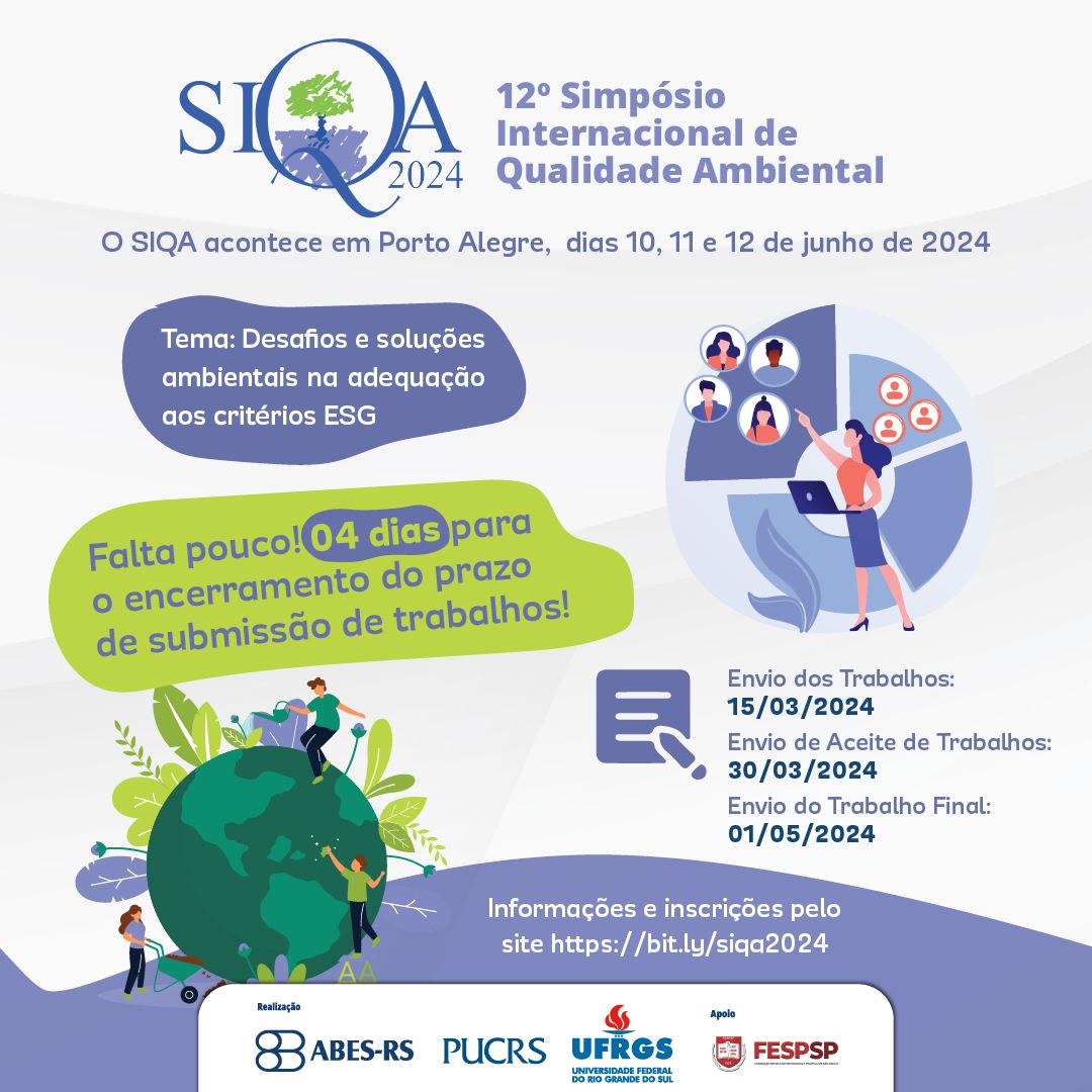 Entre los días 10 y 12 de junio, Porto Alegre será sede de la 12ª edición del Simposio Internacional sobre Calidad Ambiental – SIQA. Promovido por la Asociación Brasileña de Ingeniería Sanitaria y Ambiental Sección Rio Grande do Sul (ABES-RS), el evento tendrá como tema “Desafíos ambientales y soluciones en la adaptación a criterios ESG. El encuentro tendrá lugar en el Hotel Plaza São Rafael, en la capital de Rio Grande do Sul.