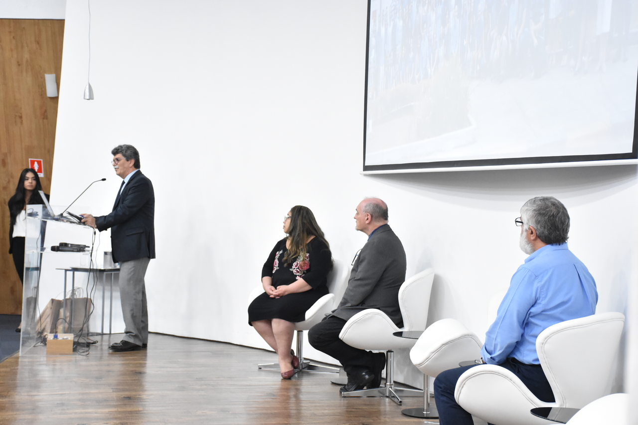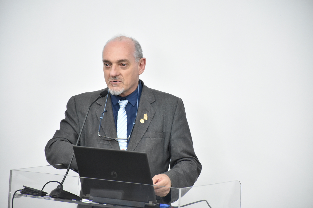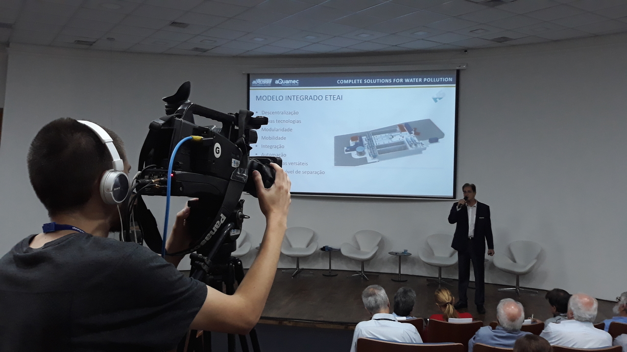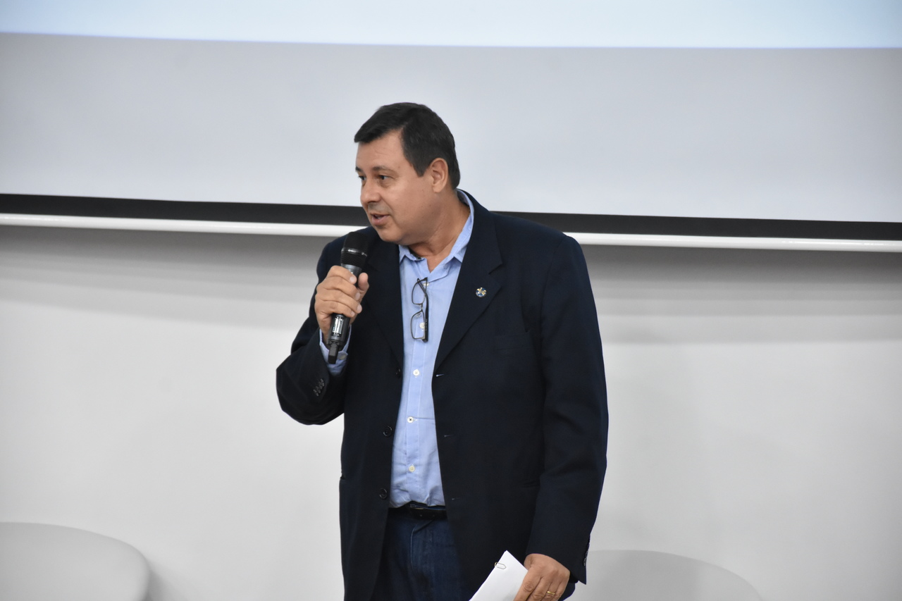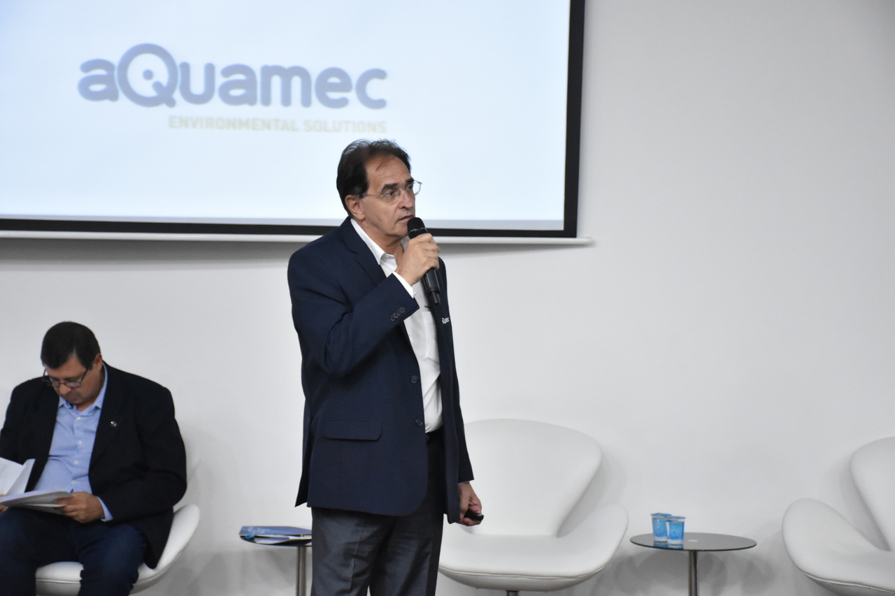 Dr. Edison Airoldi presentando la exposición “Nuevo Pinheiros, Acciones de SABESP”.