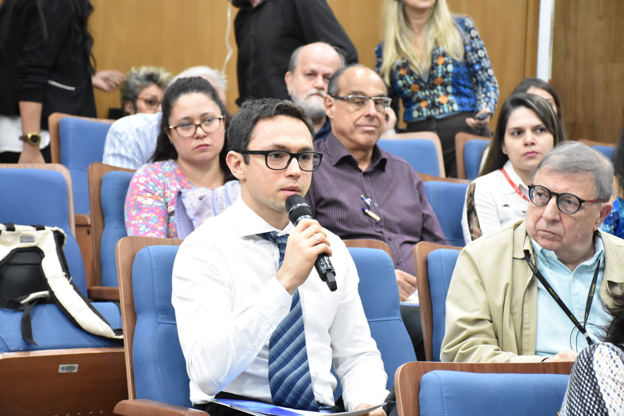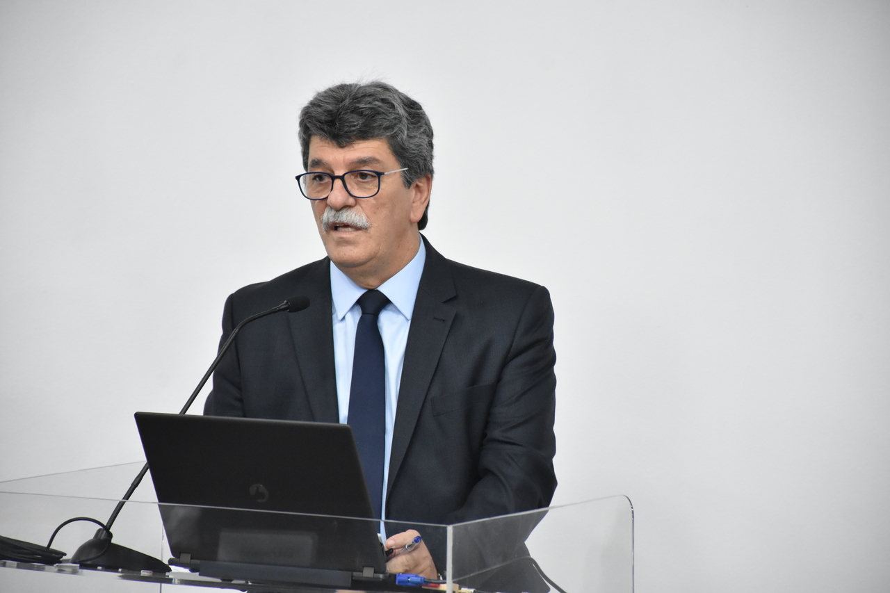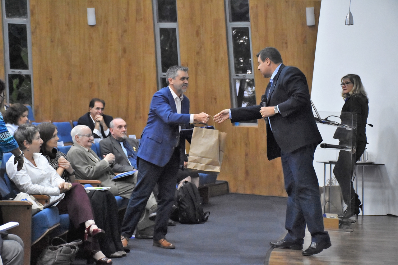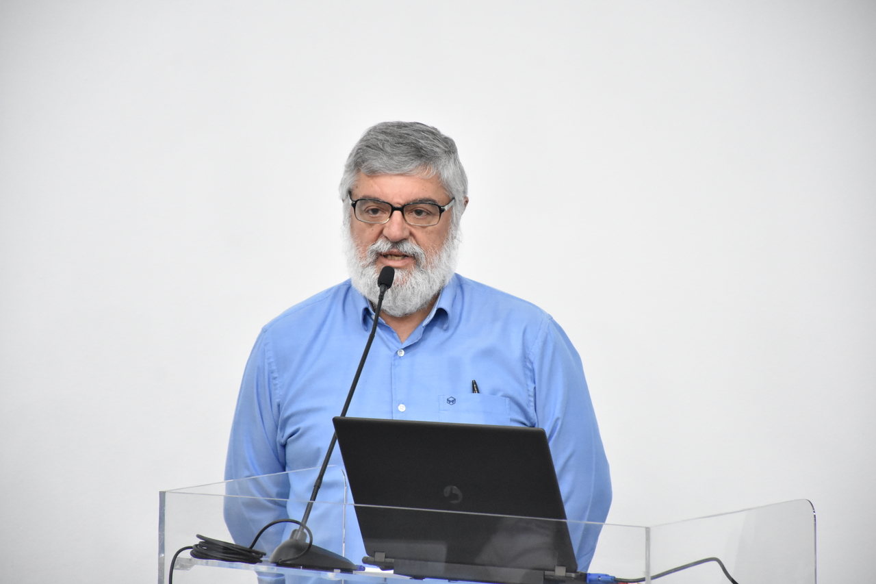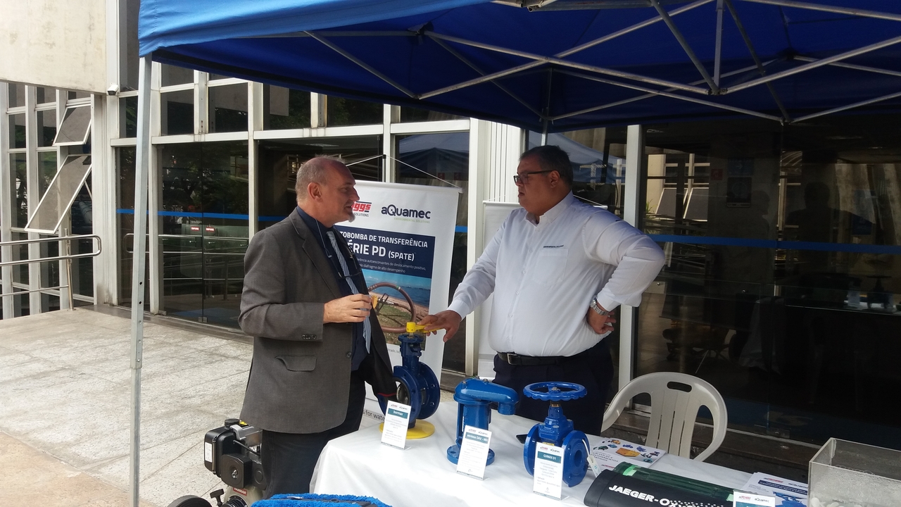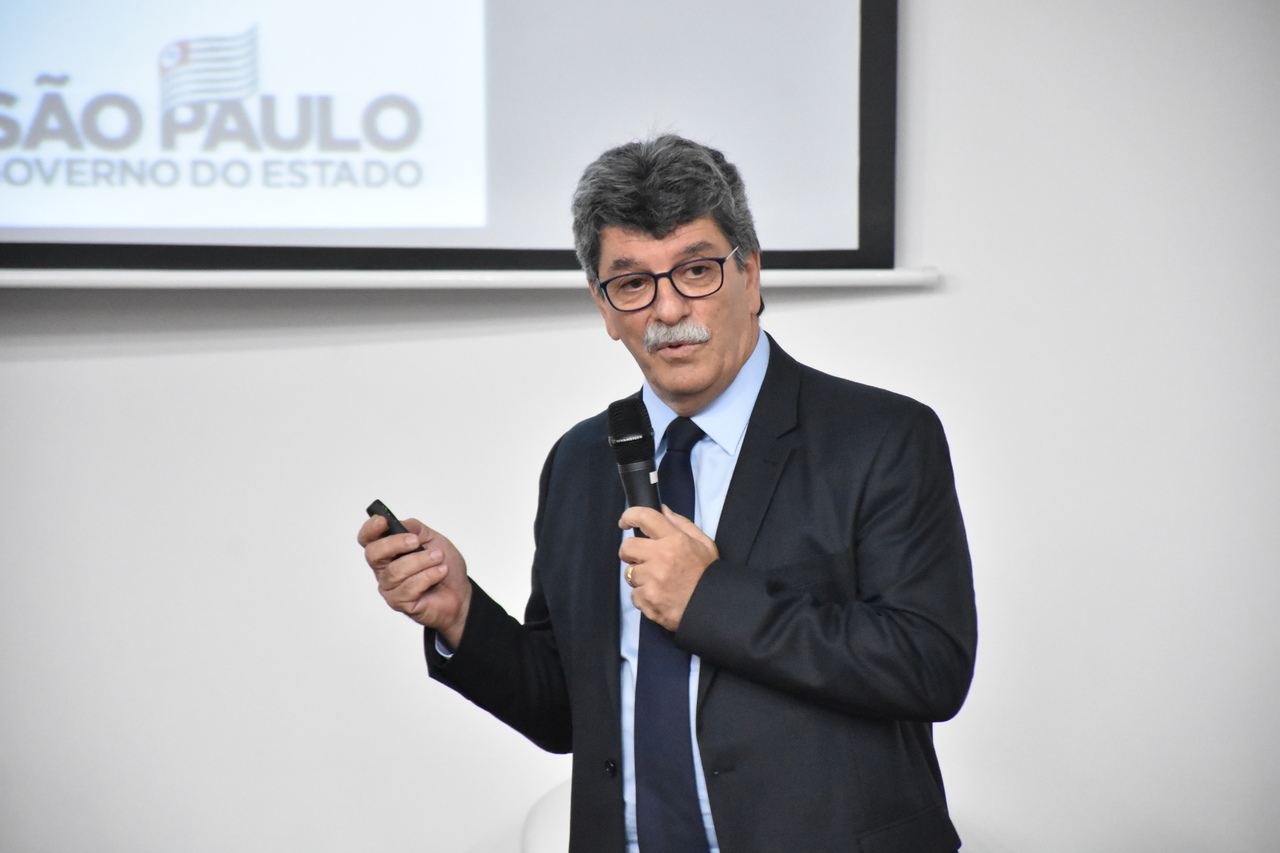 Dr. Edison Airoldi presentando la exposición “Nuevo Pinheiros, Acciones de SABESP”.