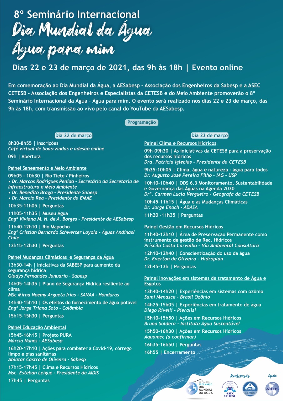 La Asociación de los Ingenieros y Profesionales de Medio Ambiente de CETESB, la ASEC, en conjunto con la Asociación de Ingenieros de SABESP, la AESABESP, promueven hace 8 años consecutivos el Seminario Internacional sobre el Día Mundial del Agua, “Agua para mí”, que este año realiza su 8ª Edición.