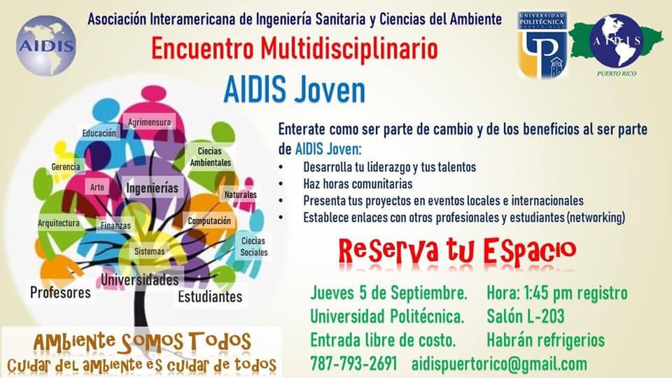 AIDIS-Puerto Rico Joven ha realizado su primera actividad en la Universidad Politécnica de Puerto Rico. Un nutrido grupo de estudiantes dijo presente a nuestro llamado para conocer sobre nuestra organización y las oportunidades que ofrece para participar en actividades educativas internacionales y locales, desarrollar liderazgo en la protección del ambiente y establecer enlaces con otros profesionales.