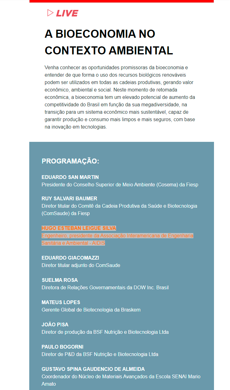 Este Evento de FIESP contará con la participación del Presidente de AIDIS MSc. Ingeniero Esteban Leigue.