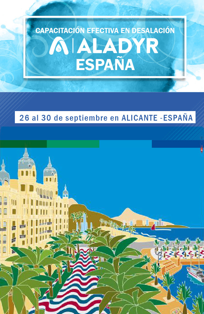 Nos complace saludarle y anunciarle que del 26 al 30 de septiembre,la Asociación Latinoamericana de Desalación y Reúso de Agua, ALADYR, en colaboración con la Universidad de Alicante, el Instituto Universitario del Agua y de las Ciencias Naturales y el aval de AEDYR y la IDA; estará realizando en la ciudad de ALICANTE / España una CAPACITACIÓN EFECTIVA EN DESALACIÓN.