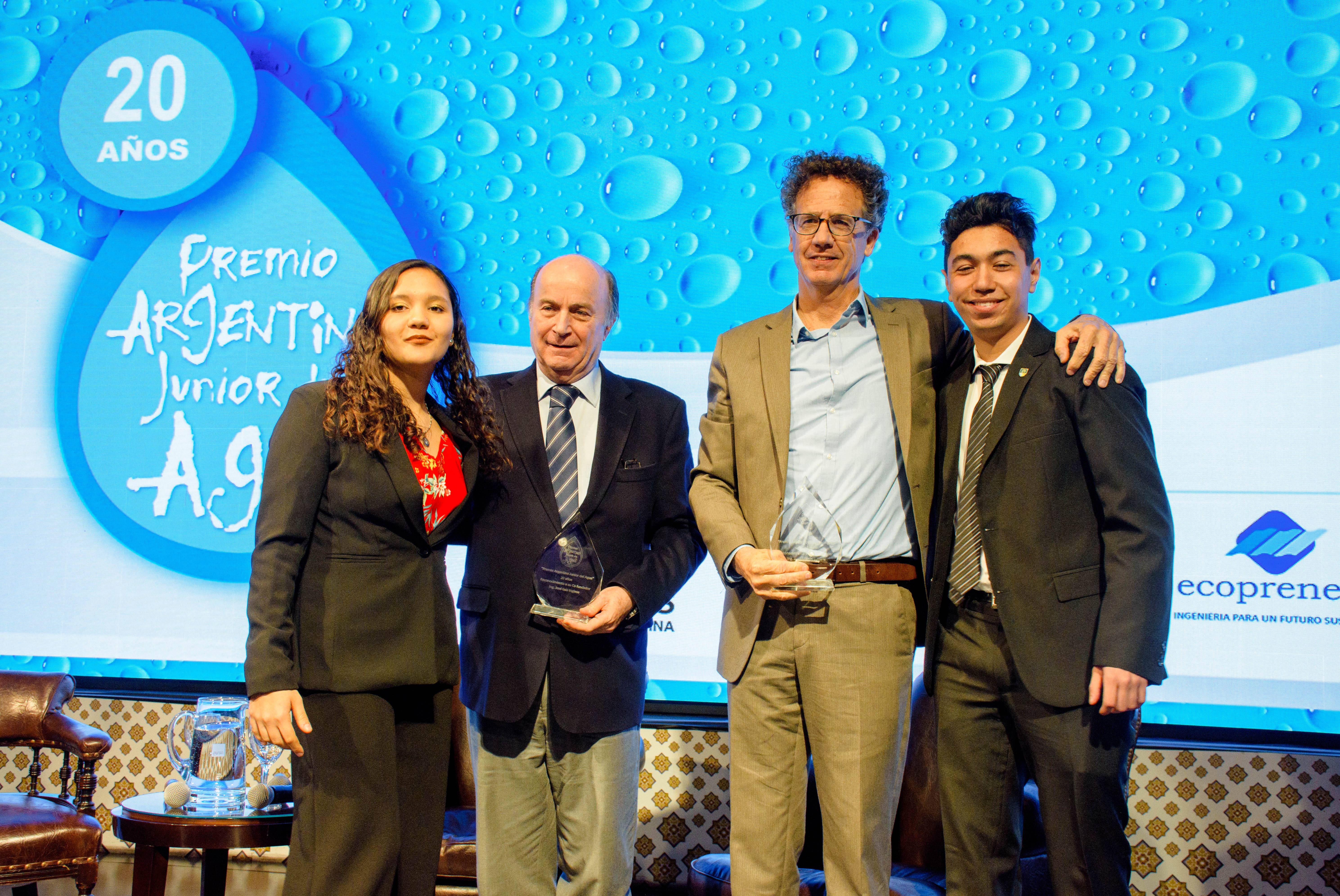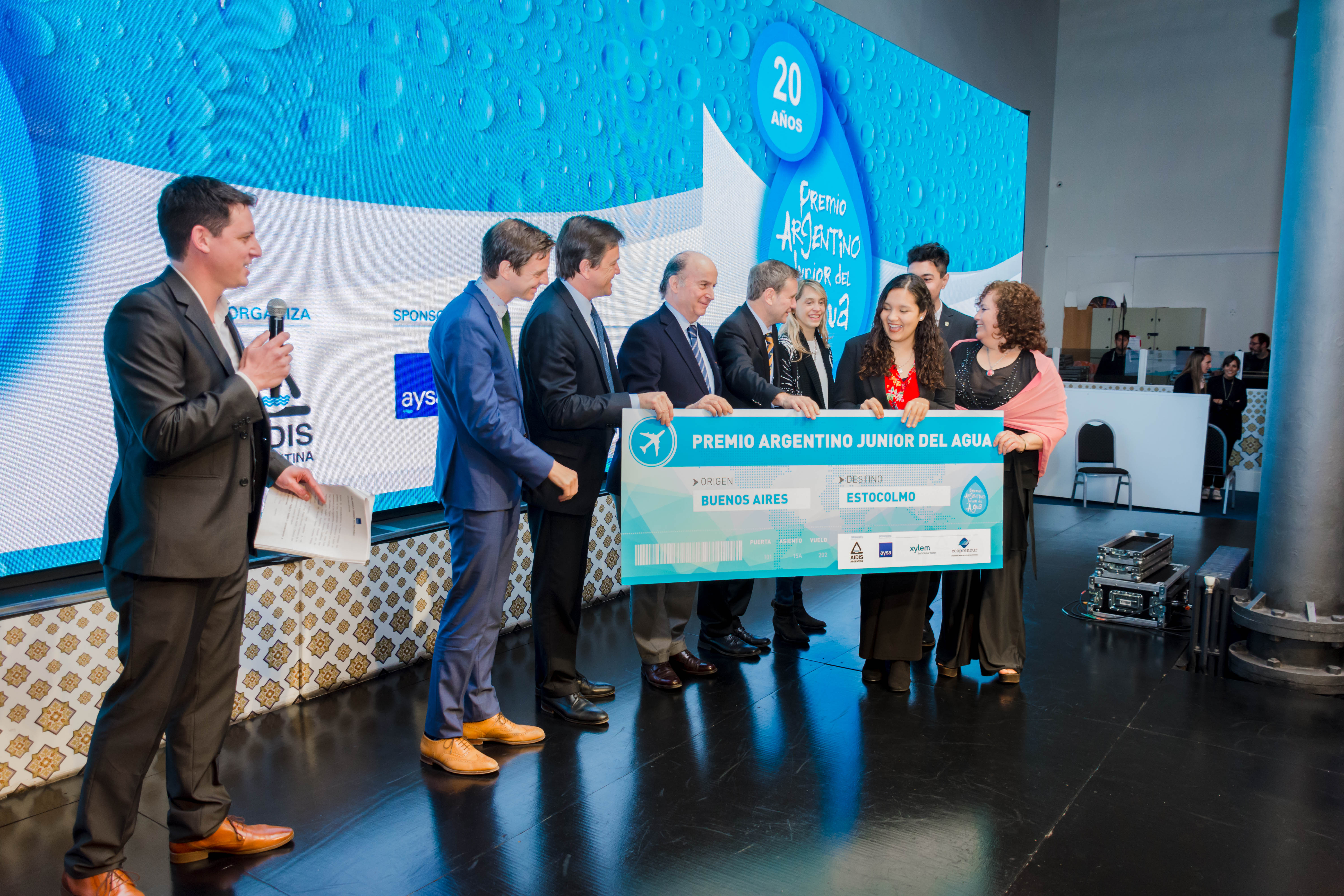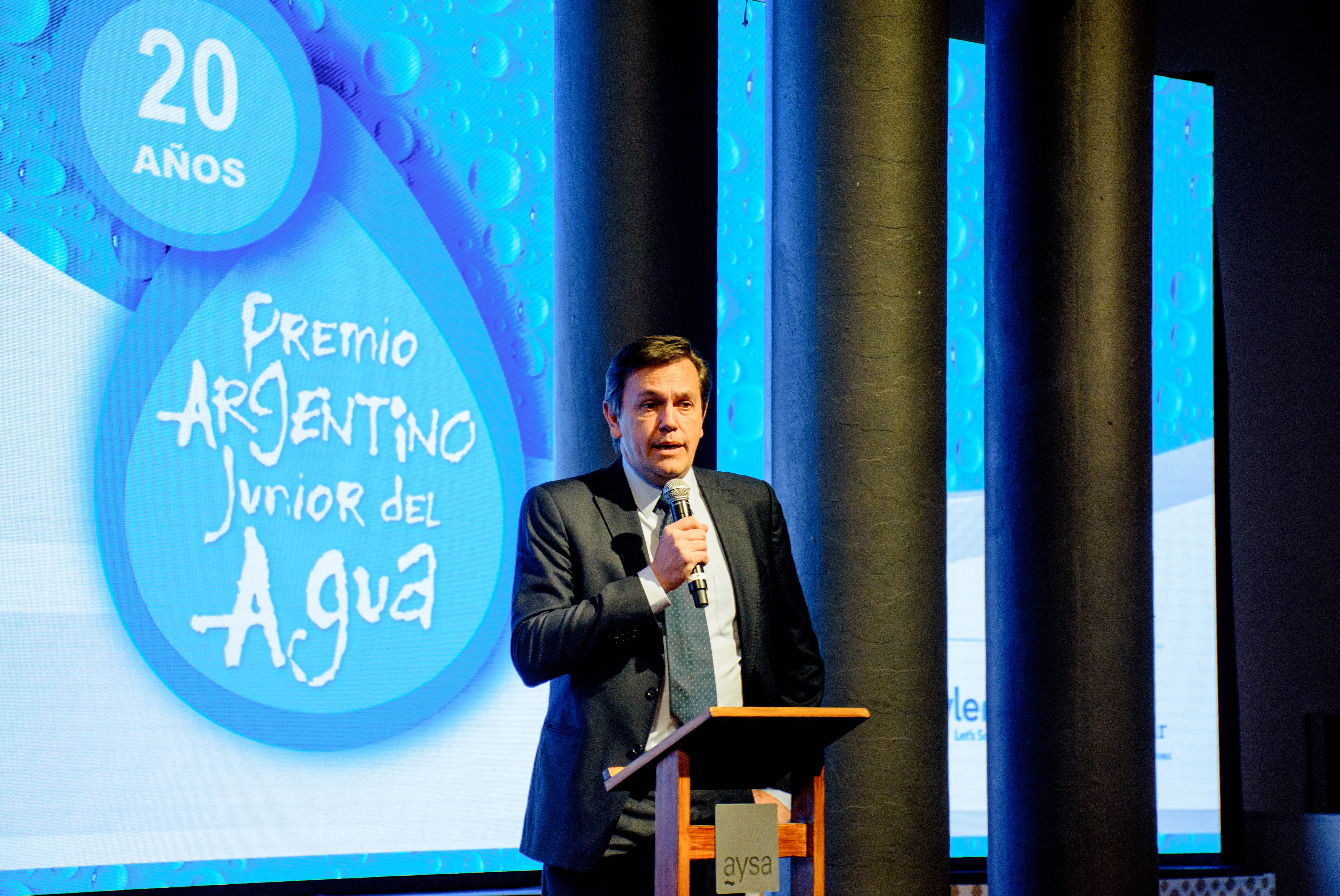 La Ceremonia de 20 años del Premio Argentino Junior del Agua se llevó a cabo en el Palacio de las Aguas Corrientes, con la presencia del Ing. José Luis Inglese, presidente de AySA; el Ing. Christian Taylor, presidente de AIDIS; el Ing. Pablo Bereciartua, Secretario de Infraestructura y Política Hídrica de la Nación; Andreas Perez Fransius, Primer Secretario de la Embajada de Suecia; el Ing. Pablo Ramatti, Director del Premio; Juan Martín Lutteral, emprendedor social con larga trayectoria en el cuidado del medioambiente; y Osvaldo Pepe, Secretario Adjunto del Sindicato Gran Buenos Aires de Trabajadores de Obras Sanitarias (SGBATOS).