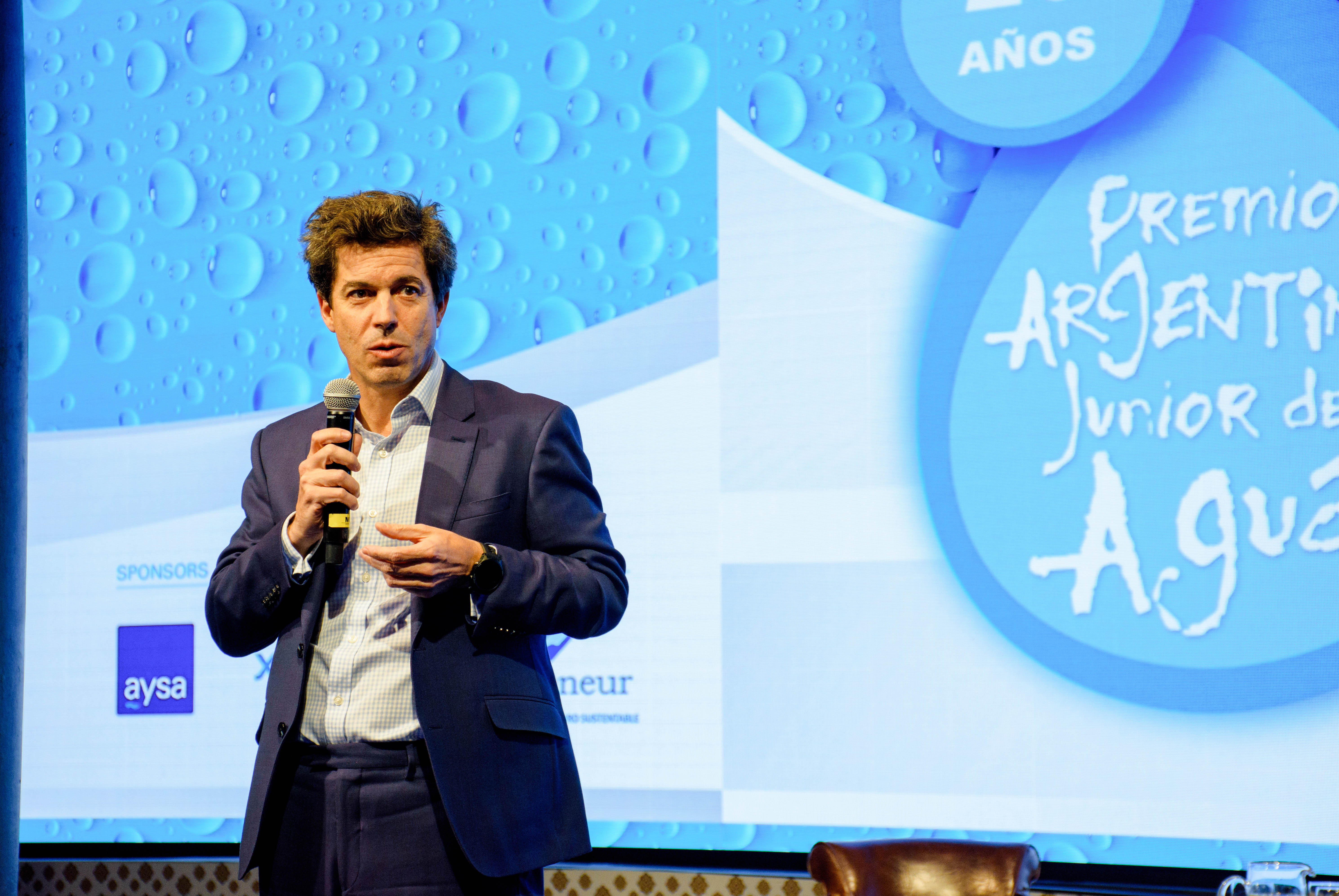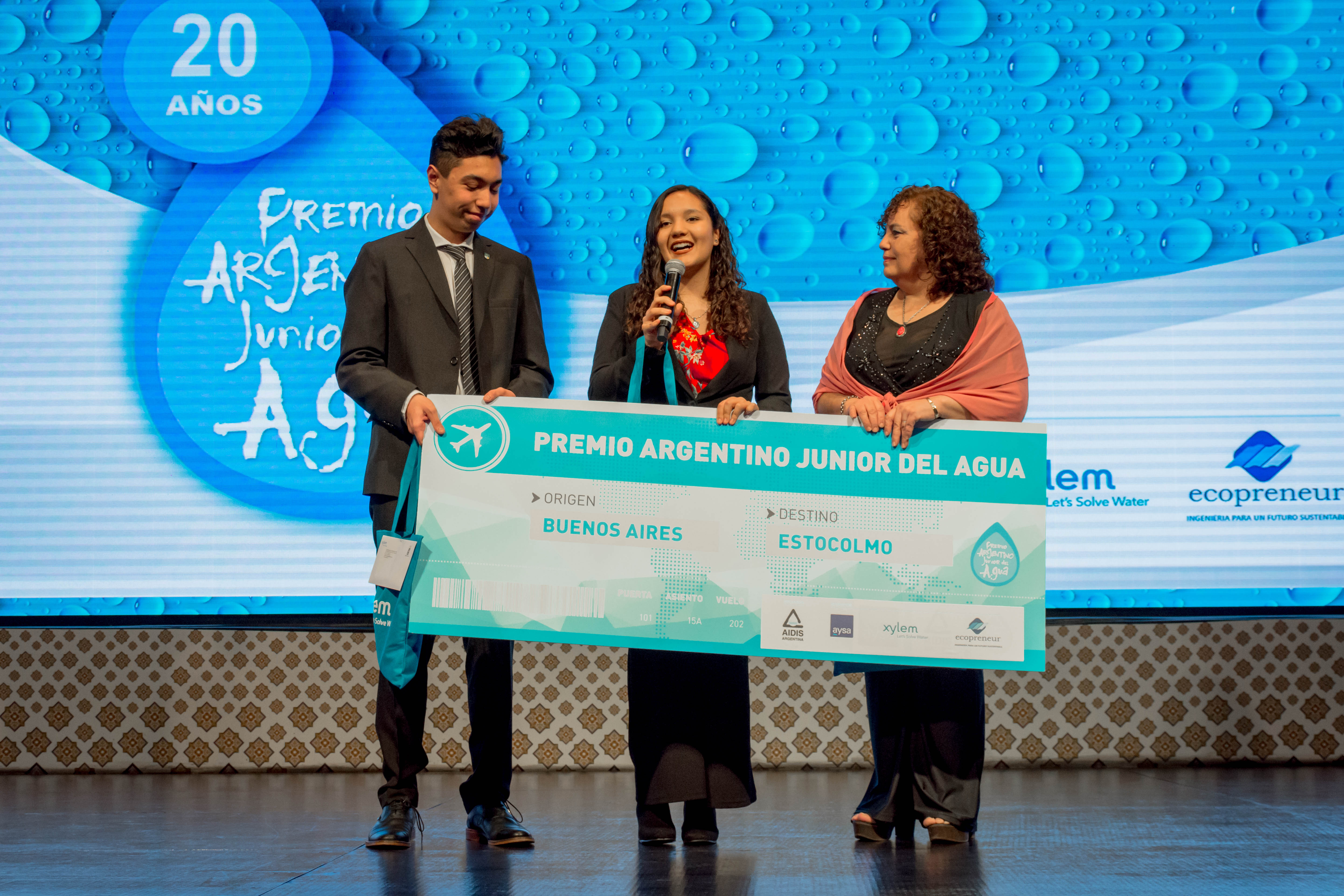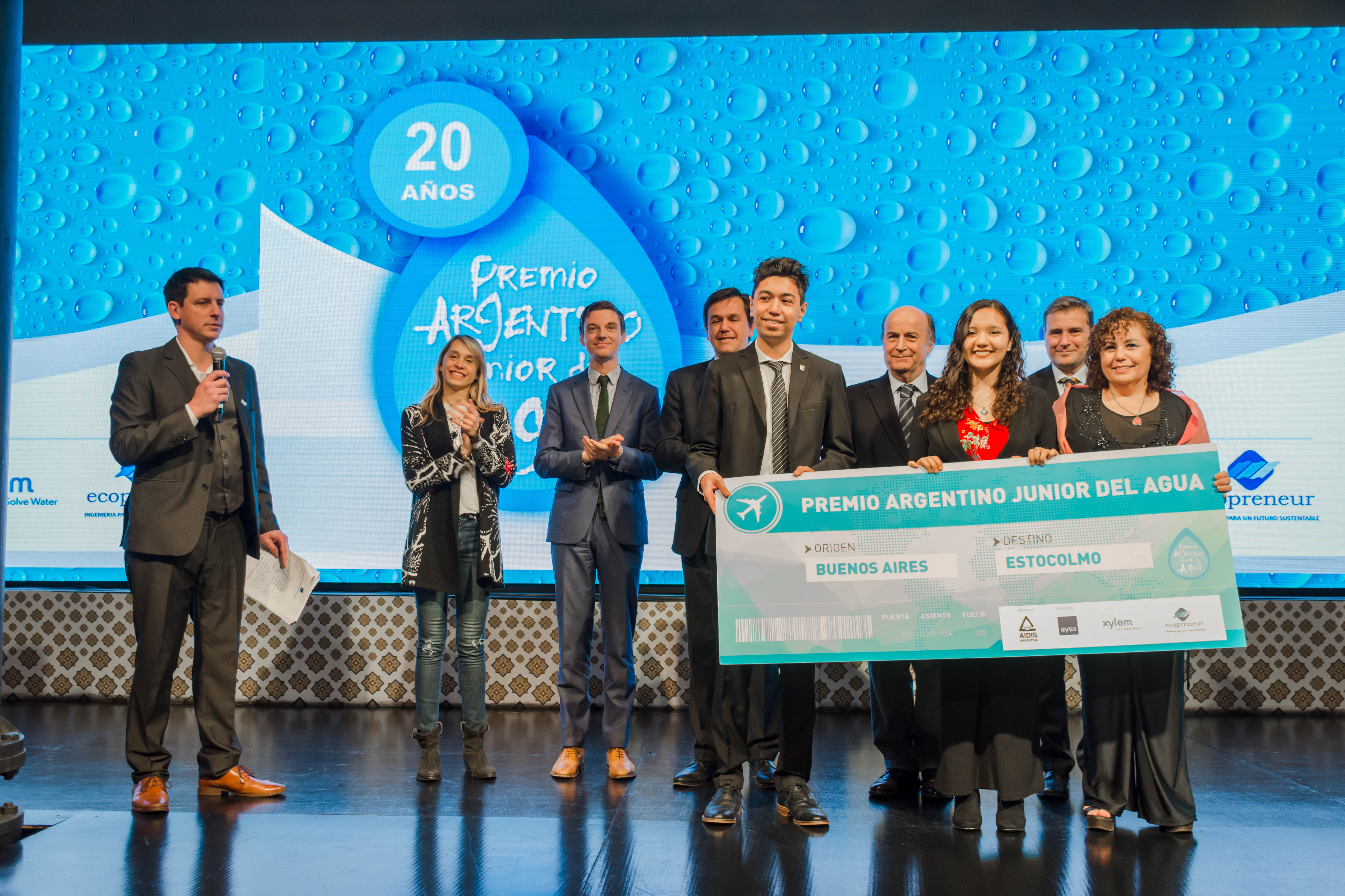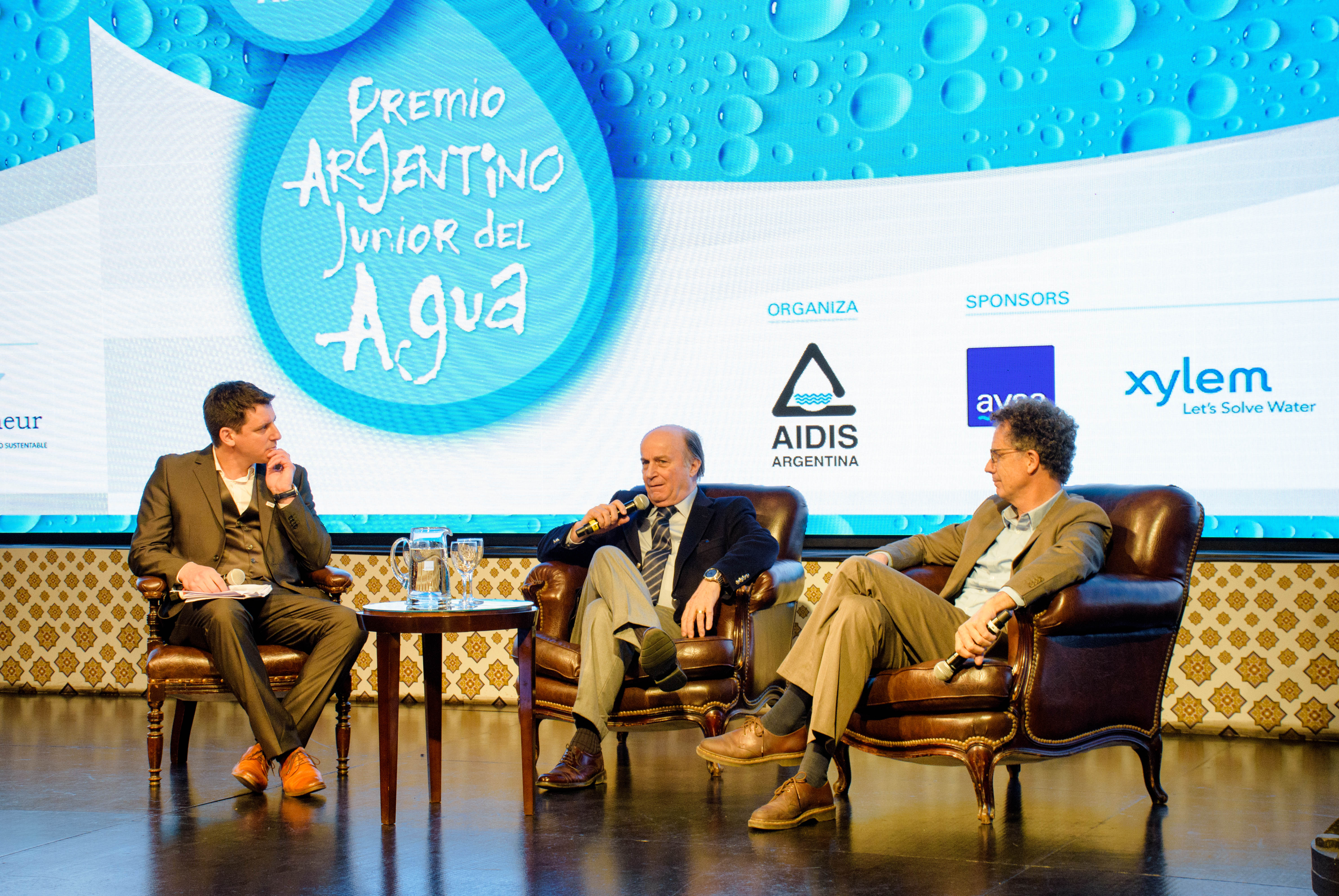 La Ceremonia de 20 años del Premio Argentino Junior del Agua se llevó a cabo en el Palacio de las Aguas Corrientes, con la presencia del Ing. José Luis Inglese, presidente de AySA; el Ing. Christian Taylor, presidente de AIDIS; el Ing. Pablo Bereciartua, Secretario de Infraestructura y Política Hídrica de la Nación; Andreas Perez Fransius, Primer Secretario de la Embajada de Suecia; el Ing. Pablo Ramatti, Director del Premio; Juan Martín Lutteral, emprendedor social con larga trayectoria en el cuidado del medioambiente; y Osvaldo Pepe, Secretario Adjunto del Sindicato Gran Buenos Aires de Trabajadores de Obras Sanitarias (SGBATOS).