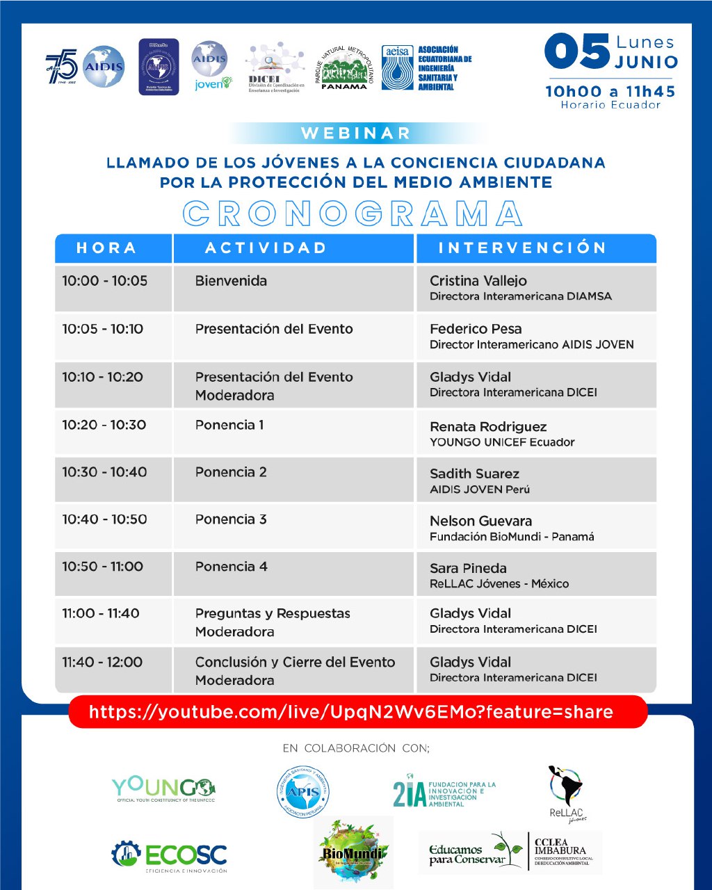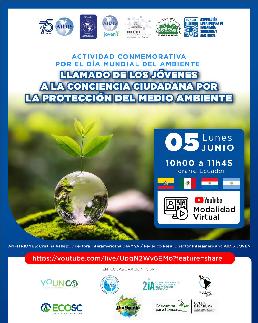 AIDIS a través de sus Divisiones de Ambientes Saludables – DIAMSA, AIDIS Joven y la División de Coordinación en Enseñanza e Investigación – DICEI, preparan esta actividad Conmemorativa del DIA MUNDIAL DEL MEDIO AMBIENTE