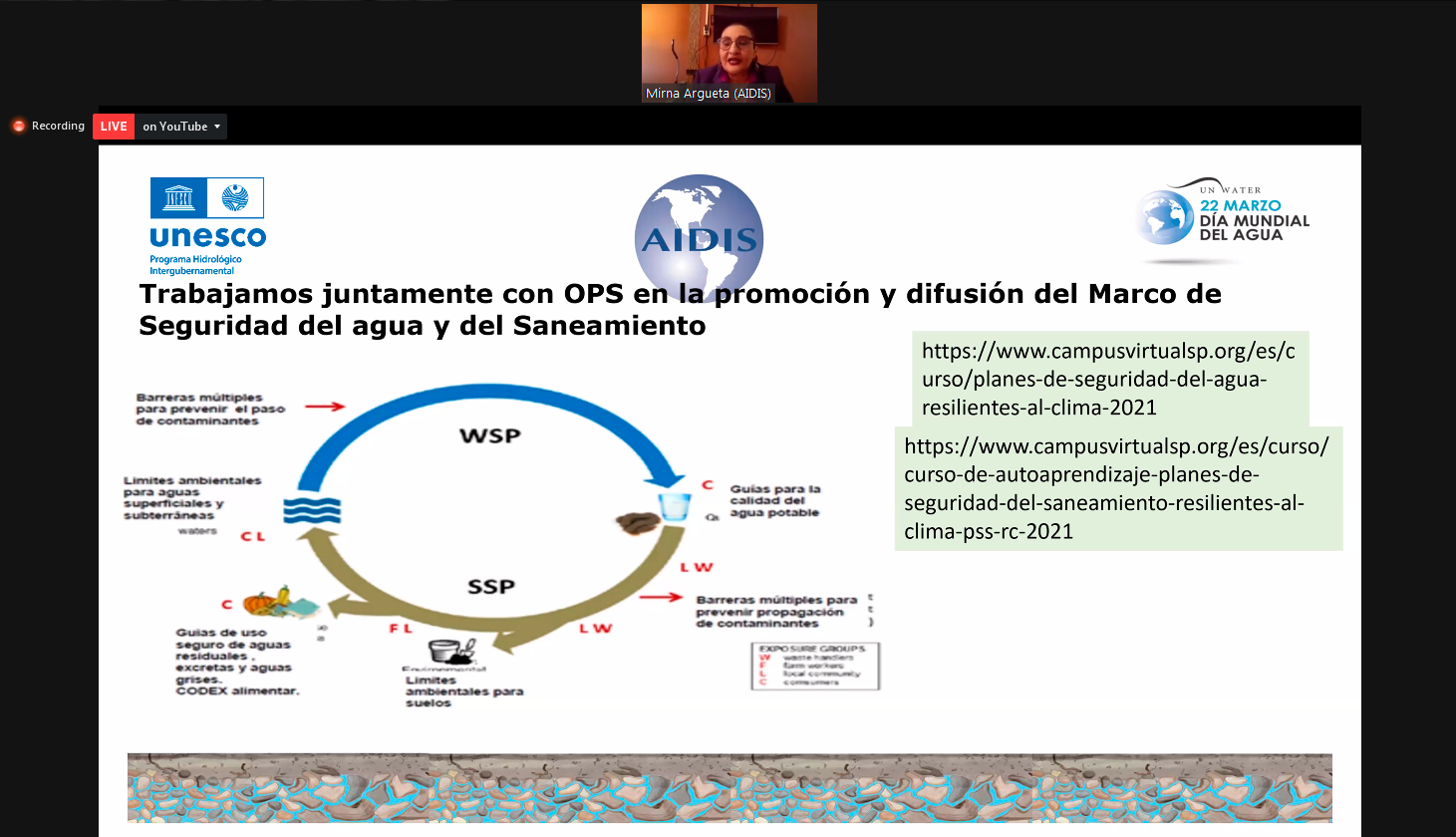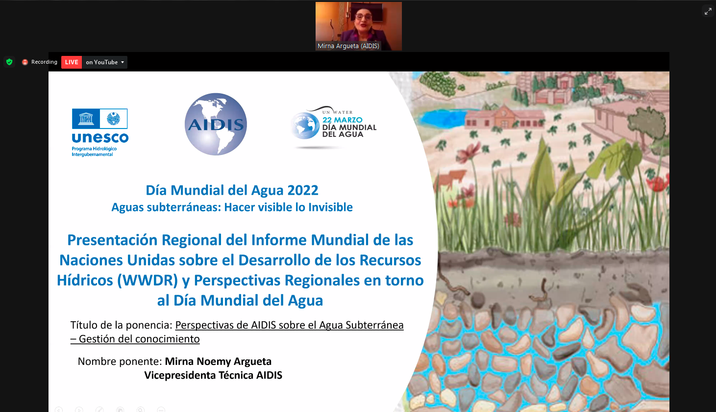 Las actividades organizadas por el Programa Hidrológico Intergubernamental en América Latina y el Caribe y socios, para la celebración del Día Mundial del Agua “22/03/2022”, incluye la Presentación Regional del Informe Mundial de las Naciones Unidas sobre el Desarrollo de los Recursos Hídricos (WWDR) y Perspectivas Regionales en torno al Día Mundial del Agua, evento en línea del cual participó AIDIS representada por la Vicepresidenta Técnica Dra. Mirna Argueta Irias.