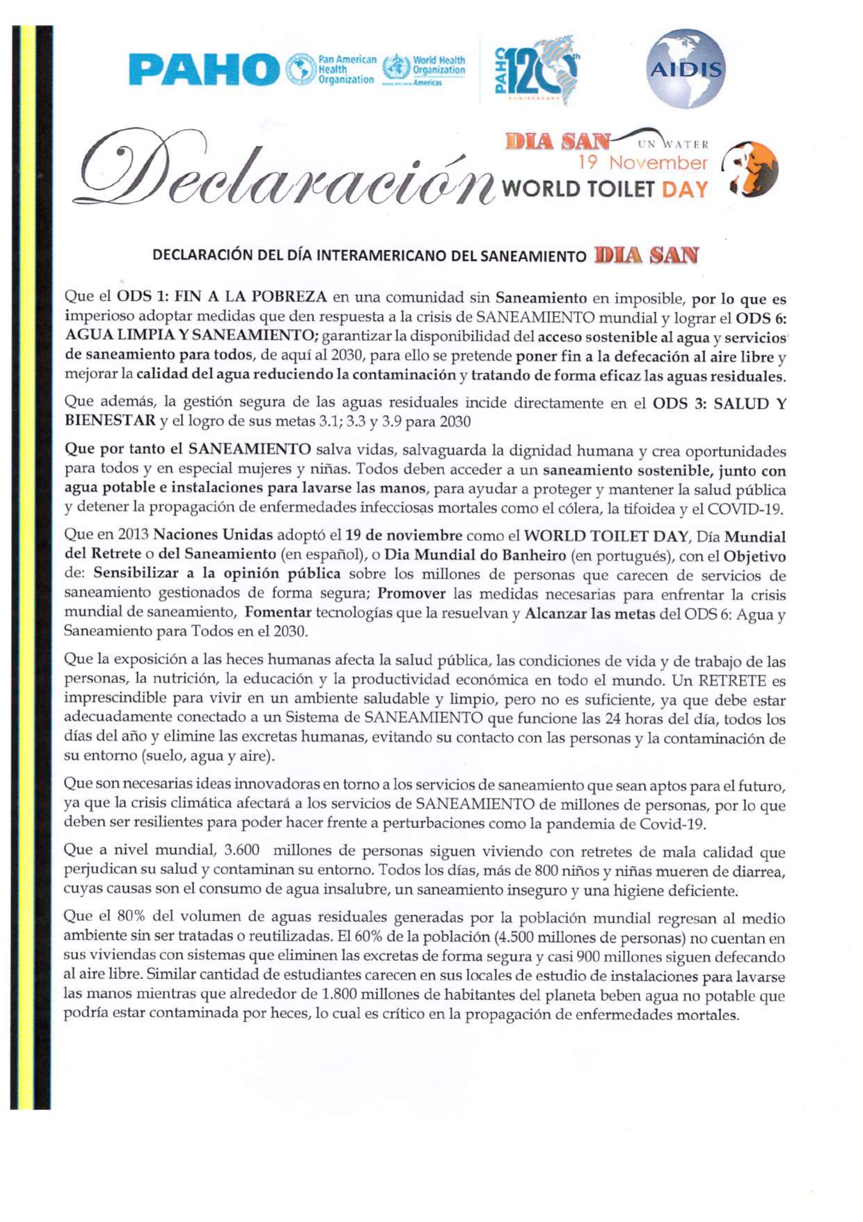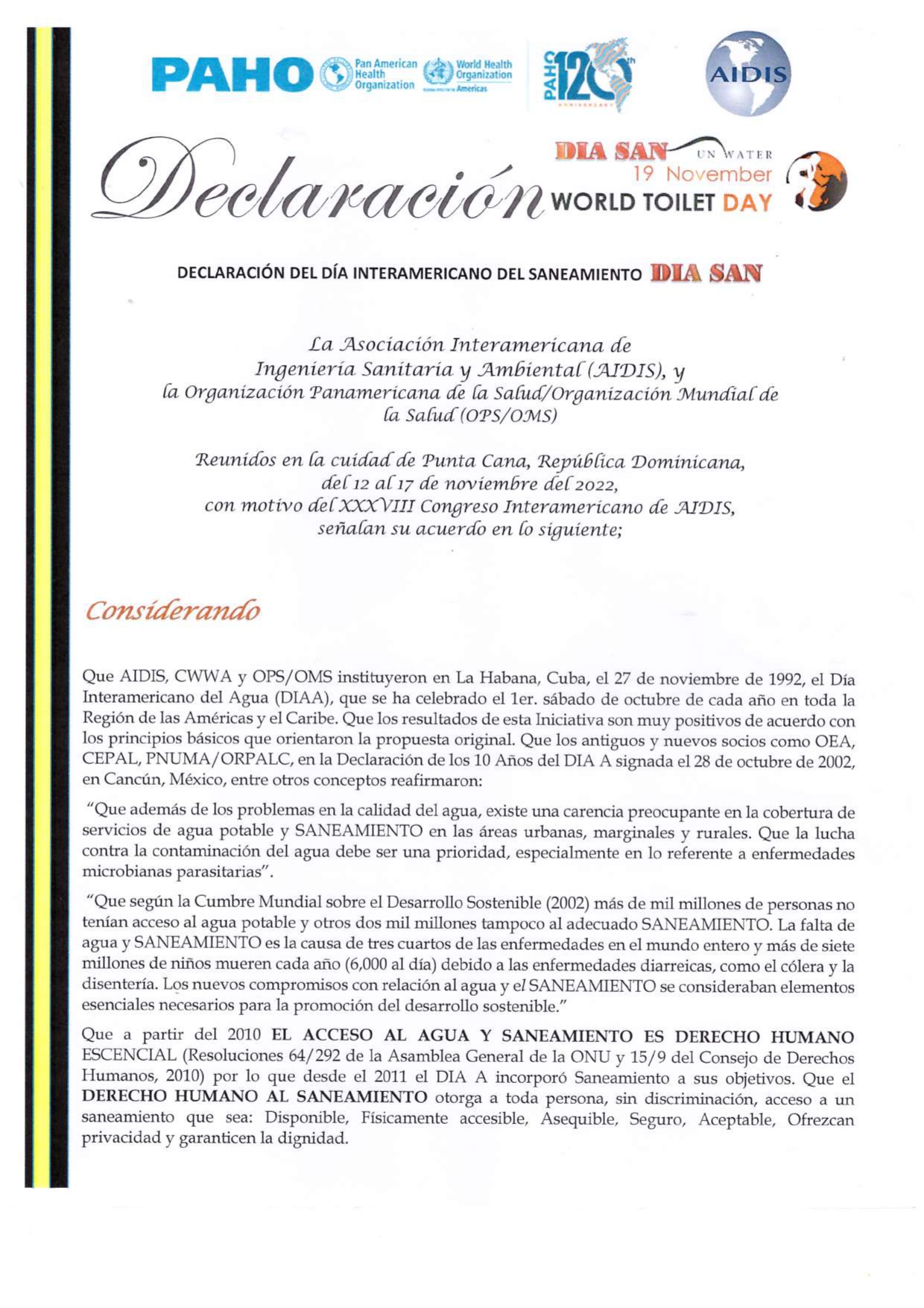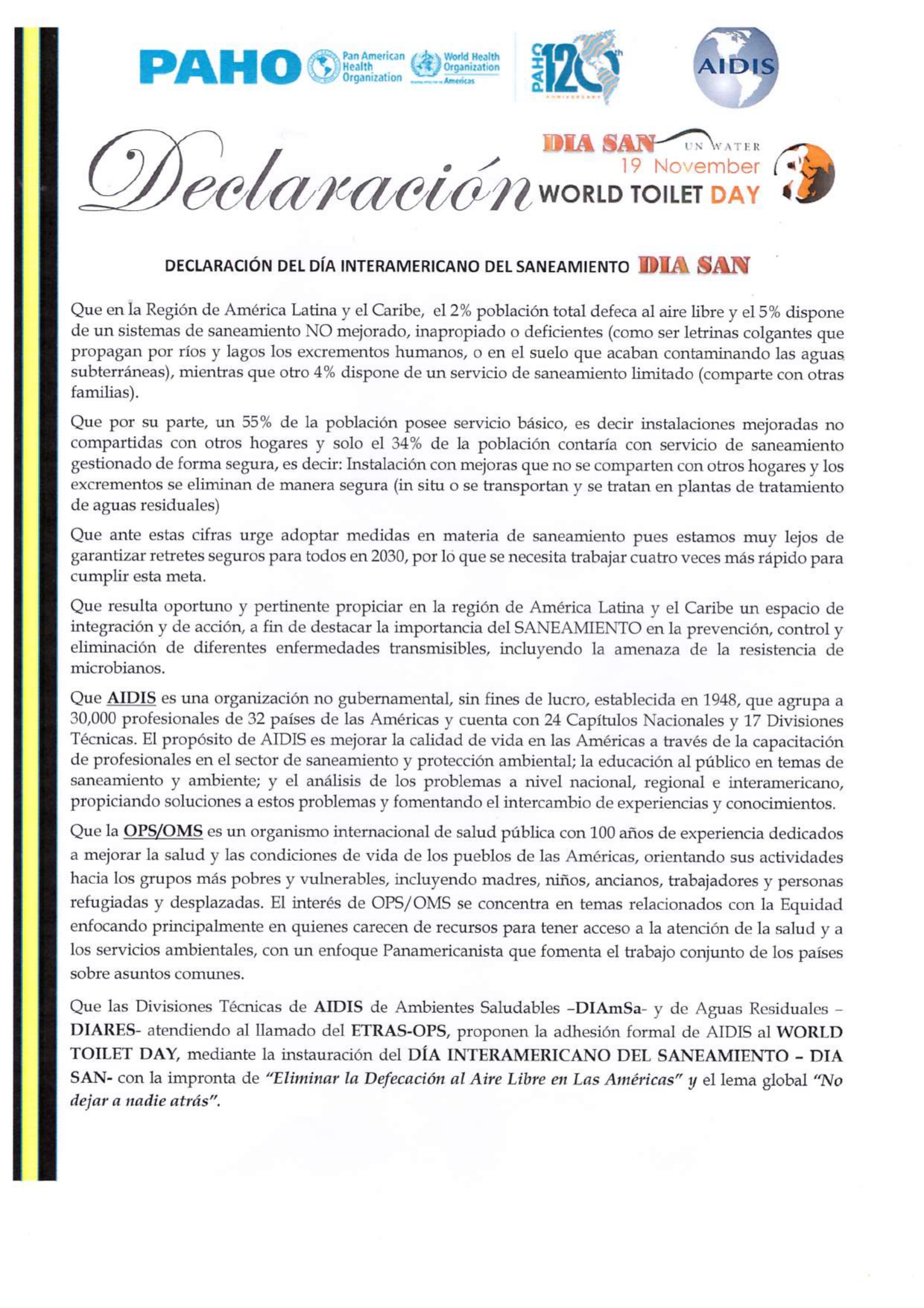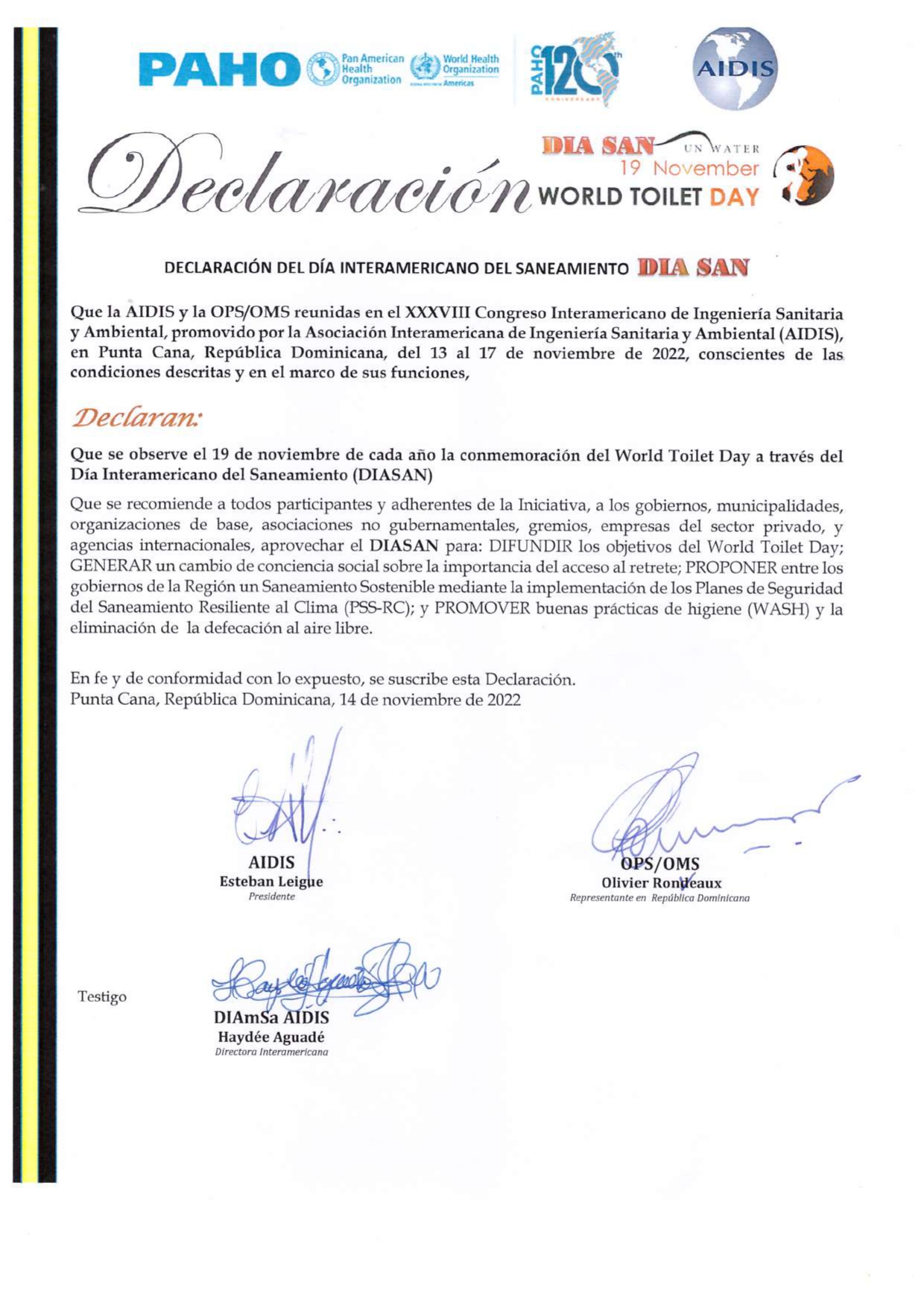 El día 14 de noviembre en el marco del XXXVIII Congreso Interamericano de AIDIS celebrado en Punta Cana, Republica Dominicana se firmó la Declaratoria del Día Interamericano del Saneamiento DIA SAN entre las Divisiones Técnicas de AIDIS de Ambientes Saludables – DIAmSA – y Aguas Residuales – DIARE – con el ETRAS – OPS, con el cual se realizó la adhesión formal de AIDIS al WORLD TOILET DAY, mientras la instauración del DÍA INTERAMERICANO DEL SANEAMIENTO – DIA SAN – con la impronta de “Eliminar la Defecación al Aire Libre en Las Américas” y el lema global “No deja a nadie atrás”