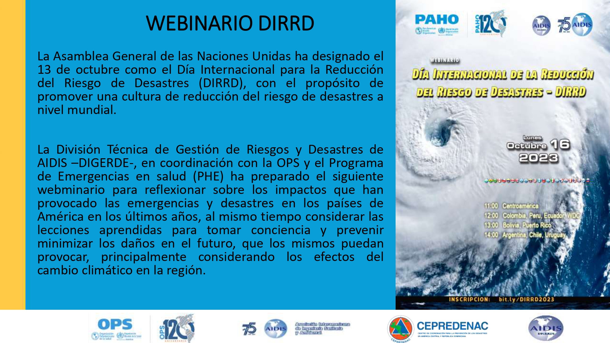 La División Técnica de Gestión de Riesgos y Desastres de AIDIS –DIGERDE-, en coordinacion con OPS y el Programa de Emergencias en salud (PHE) prepara el siguiente webminar para reflexionar sobre los impactos que han provocado las emergencias y desastres en los países de América en los últimos años, al mismo tiempo considerar las lecciones aprendidas para tomar conciencia y prevenir minimazar los daños en el futuro, que los mismos puedan provocar, principalmente considerando los efectos del cambio climático en la región.