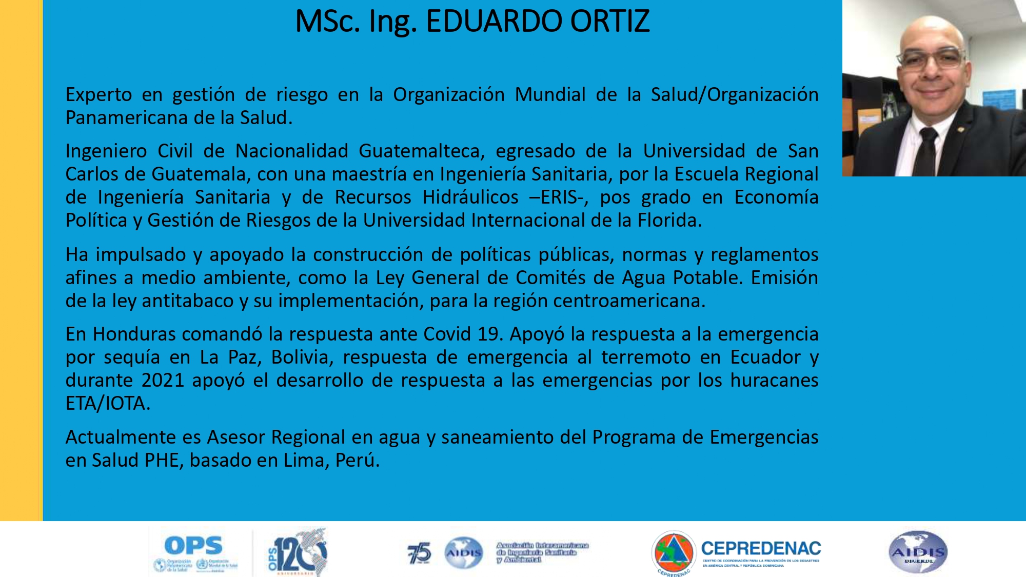 | 11:25 | OPS/OMS, lecciones aprendidas en América en relación con las emergencias y desastres en agua y saneamiento. | Ing. Eduardo Ortíz | OPS/OMS |