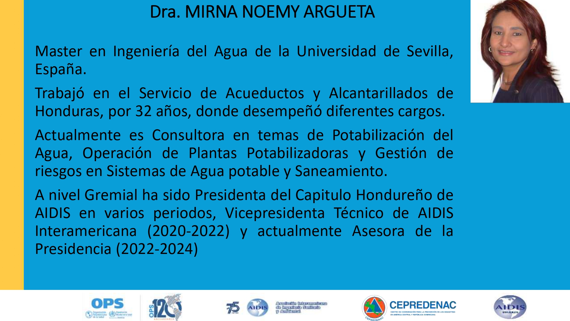 | 12:05 | Lecciones aprendidas principales desastres en Centro América. | Dra. Mirna Argueta | Asesora Vicepresidencia Técnica de AIDIS |