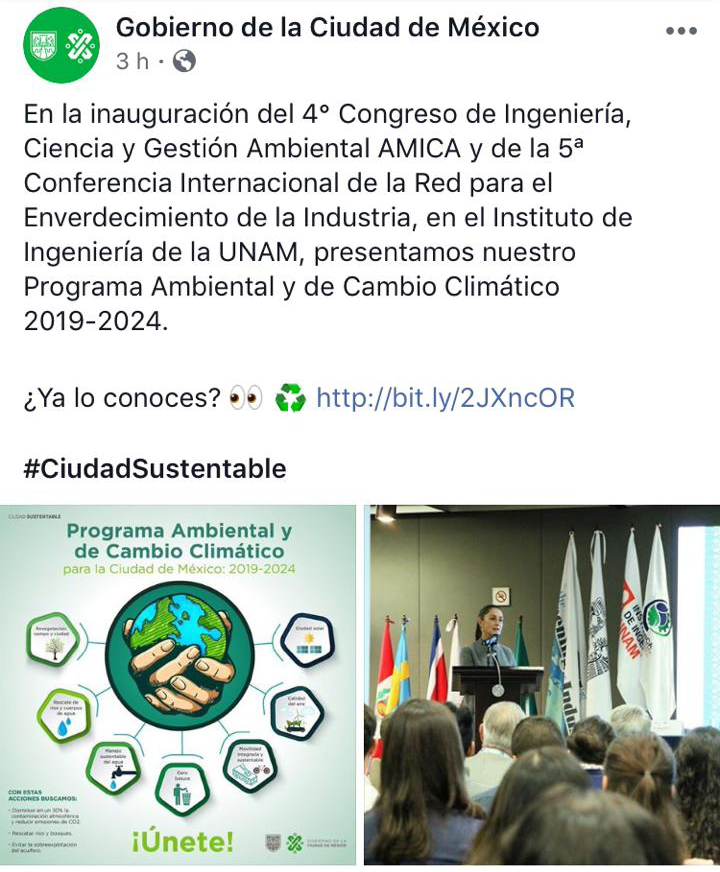 La jefa de Gobierno de la Ciudad de México, Claudia Sheinbaum Pardo, presentó ante investigadores, representantes gubernamentales y la iniciativa privada el Programa Ambiental y de Cambio Climático que impulsa su administración con el que se busca disminuir en 30 por ciento la contaminación atmosférica, así como las emisiones de dióxido de carbono.
