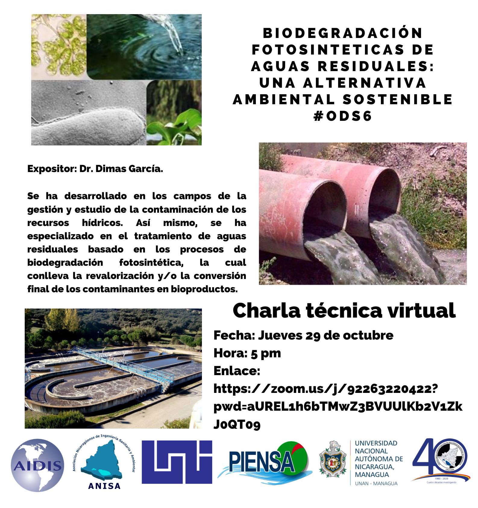 “Biodegradación Fotosintéticas de Aguas Residuales: Una alternativa ambiental sostenible #ODS6” estará a cargo del Dr. Dimas García. A realizarse el día jueves 29 de octubre, a las 5 pm (GMT -6)