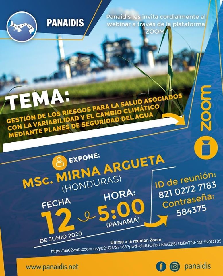 El 12 de junio a las 5:00 PM se realizará el Webinar “Gestión de los Riesgos para la Salud Asociados con la Variabilidad y el Cambio Climático Mediante Planes de Seguridad del Agua” dictado por la M.Sc. Mirna Argueta de Honduras.