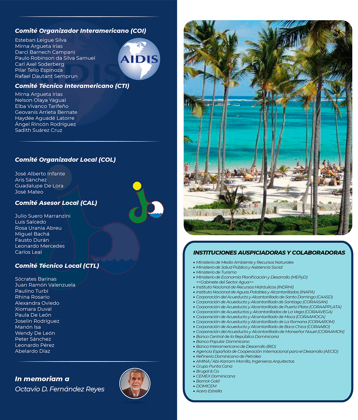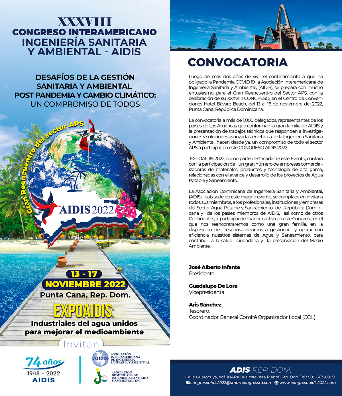 XXXVIII CONGRESO INTERAMERICANO DE INGENIERÍA SANITARIA Y AMBIENTAL DE AIDIS “Desafíos De La Gestión Sanitaria Y Ambiental, Post Pandemia Y Cambios Climáticos. Un Compromiso De Todos” tendrá lugar de forma presencial del 13 al 17 de noviembre de 2022 en Bávaro, Punta Cana, República Dominicana.