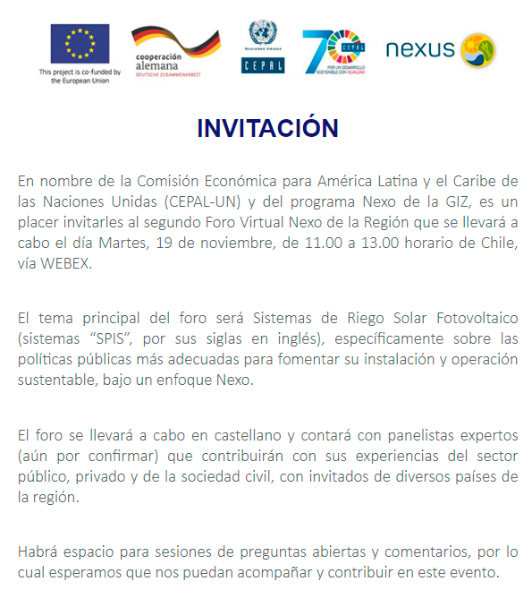 En nombre de la Comisión Económica para América Latina y el Caribe de las Naciones Unidas (CEPAL-UN) y del programa Nexo de la GIZ, es un placer invitarles al segundo Foro Virtual Nexo de la Región que se llevará a cabo el día Martes, 19 de noviembre, de 11.00 a 13.00 horario de Chile, vía WEBEX.