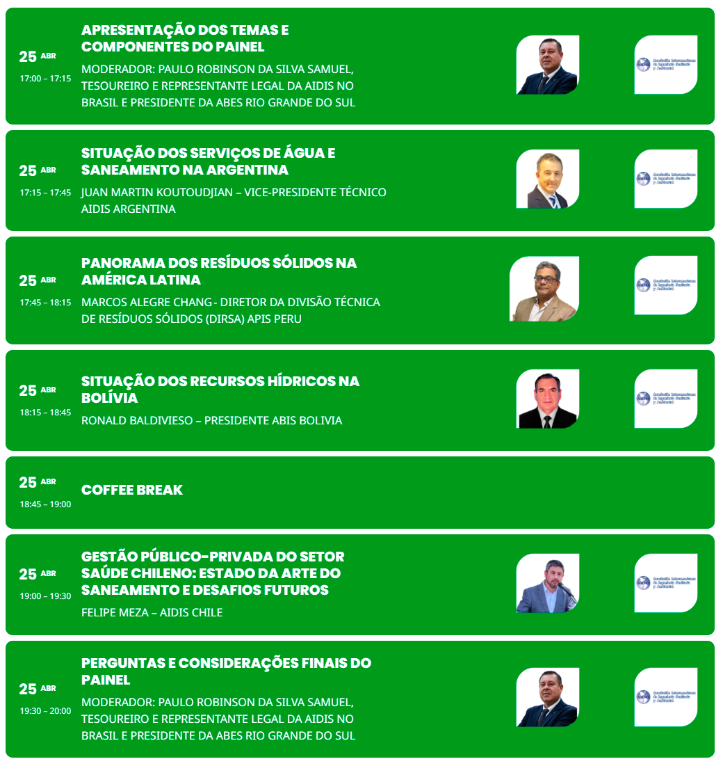 Del 24/06 al 26/06, de 8:00 a 20:00 horas, el Auditorio IFAT Brasil será el escenario de una completa programación con la participación de los siguientes paneles: Panel ABREMA-ABIOGÁS (El Panorama de los Residuos Sólidos en Brasil y tecnologías para el futuro del sector); Panel EUCD – Diálogos sobre el clima de la Unión Europea: Reducción de emisiones mediante la producción sostenible de biogás y biometano; Panel AHK – Tecnologías y mejores prácticas alemanas para el mercado de saneamiento – Presencia de la Asociación Alemana para el Agua y la Asociación Alemana para los Residuos RETECH; ISWA – Panel internacional capítulo América Latina y el Caribe – El sector residuos bajo análisis, sus tecnologías y avances latinos; Panel ABCP – El papel transformador de la industria del cemento en la economía circular de residuos; Panel ABREMA – Frente Parlamentario de Economía Verde: Residuos Sólidos, El Combustible del Futuro; Panel AIDIS – Panorama del Saneamiento en América Latina; PANEL ISLE Utilities: Inteligencia Artificial para la gestión de agua y alcantarillado; Panel de Gobierno Federal – BNDES Y ANA – Regularización del mercado de Saneamiento y organización de bloques regionales de universalización. Financiamiento de frentes y proyectos para la implementación de tecnologías ambientales; Panel: SINDESAM | ABIMAQ Tecnología hecha en Brasil para traer el país del futuro al presente; y Panel DAEE: Acciones, Normas y Políticas Públicas del Estado de São Paulo para la gestión sostenible de los recursos hídricos.