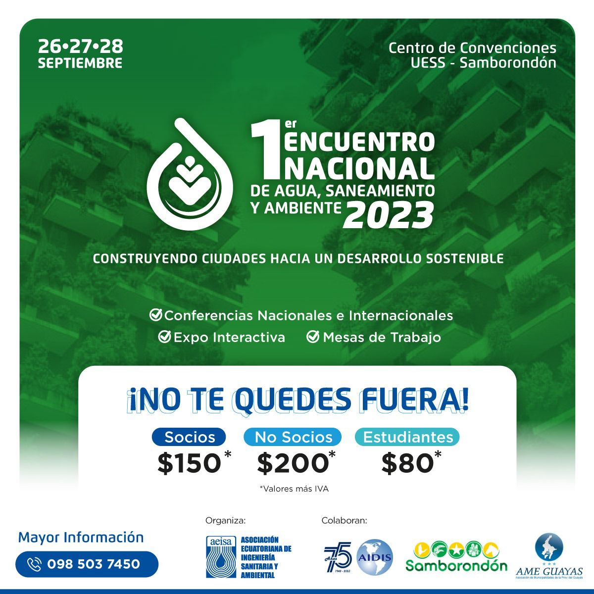 La Asociación Ecuatoriana de Ingeniería Sanitaria y Ambiental- AEISA, los invita a participar a su próximo evento “Primer Encuentro Nacional de Agua, Saneamiento y Ambiente 2023 Construyendo Ciudades hacia un desarrollo Sostenible”, el cual se llevará a cabo el 26, 27 y 28 de septiembre de 2023 en el Centro de Convenciones de la UESS ubicado en el Km 2.5, vía La Puntilla Samborondón.