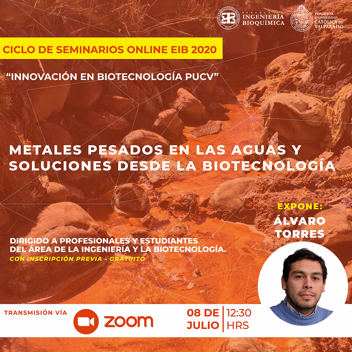 Invitamos al quinto seminario del ciclo cuyo expositor será el Dr. Álvaro Torres con el seminario “Metales pesados en las aguas y soluciones desde la biotecnología”, el miércoles de 8 de julio de 2020 a las 12:30 horas Chile.