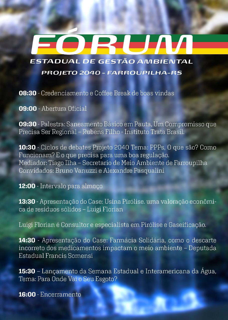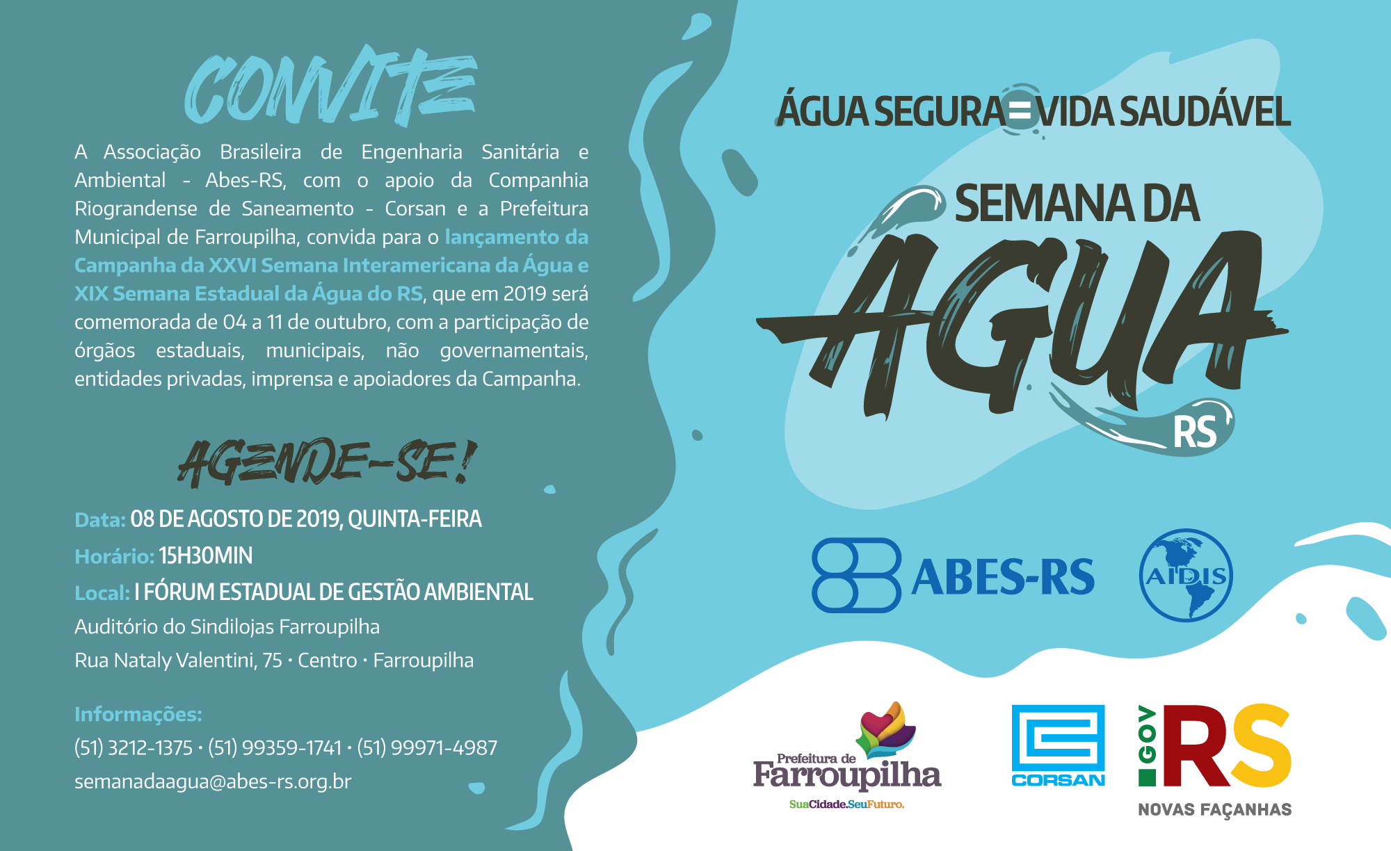 Un cordial saludo de la Asociación Brasileña de Ingeniería Sanitaria y Ambiental – ABES-RS, con el apoyo de la Compañía de Saneamiento Riograndense – Corsan y el Munícipio de Farroupilha, se complace en invitarlos a asistir al lanzamiento de la XXVI Campaña de la Semana Interamericana del Agua y la XIX Semana Estatal del Agua de Rio Grande do Sul, que se celebrará del 4 al 11 de octubre de 2019, con la participación de agencias estatales, municipales, no gubernamentales, entidades privadas, la prensa y simpatizantes.