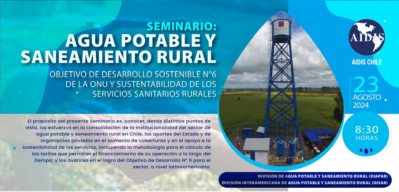 En este Seminario, organizado por la División Técnica de Agua Potable y Saneamiento Rural (DIAPAR), del Capítulo Chileno de AIDIS (Asociación Interamericana de Ingeniería Sanitaria y Ambiental), en conjunto con la División Técnica Interamericana de la misma especialidad (DISAR), se profundizará sobre estos temas, dividiéndolos en dos bloques. En el primero, se analizarán, desde distintos puntos de vista, los esfuerzos en la consolidación de la institucionalidad del sector de agua potable y saneamiento rural en Chile, los aportes del Estado y de organismos privados en la construcción y operación de los servicios, incluyendo la metodología para el cálculo de las tarifas que permitan el financiamiento de su operación a lo largo del tiempo.  En el segundo bloque, se analizarán los avances, a nivel latinoamericano, en el logro del Objetivo de Desarrollo N°6 para el sector, y se presentarán los instrumentos que poseen los organismos de financiamiento internacional para apoyar a los países de América Latina y el Caribe en el aumento de las coberturas y en la sostenibilidad de los servicios de agua potable y saneamiento rural.