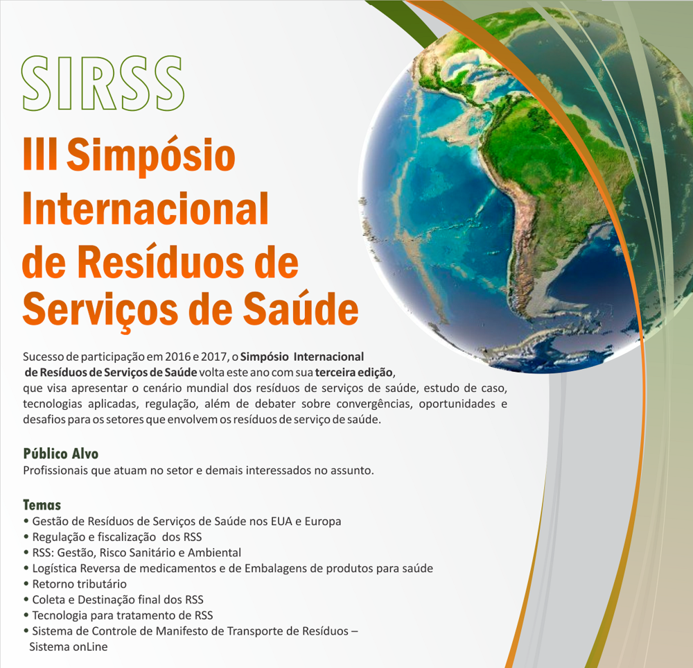 Sucesso de participação em 2016 e 2017, a terceira edição do simpósio neste ano de 2019 visa apresentar o cenário mundial dos resíduos de serviços de saúde, estudos de caso, tecnologias aplicadas, regulação, além de debater sobre convergências, oportunidades e desafios para os setores que envolvem os resíduos de serviço de saúde.