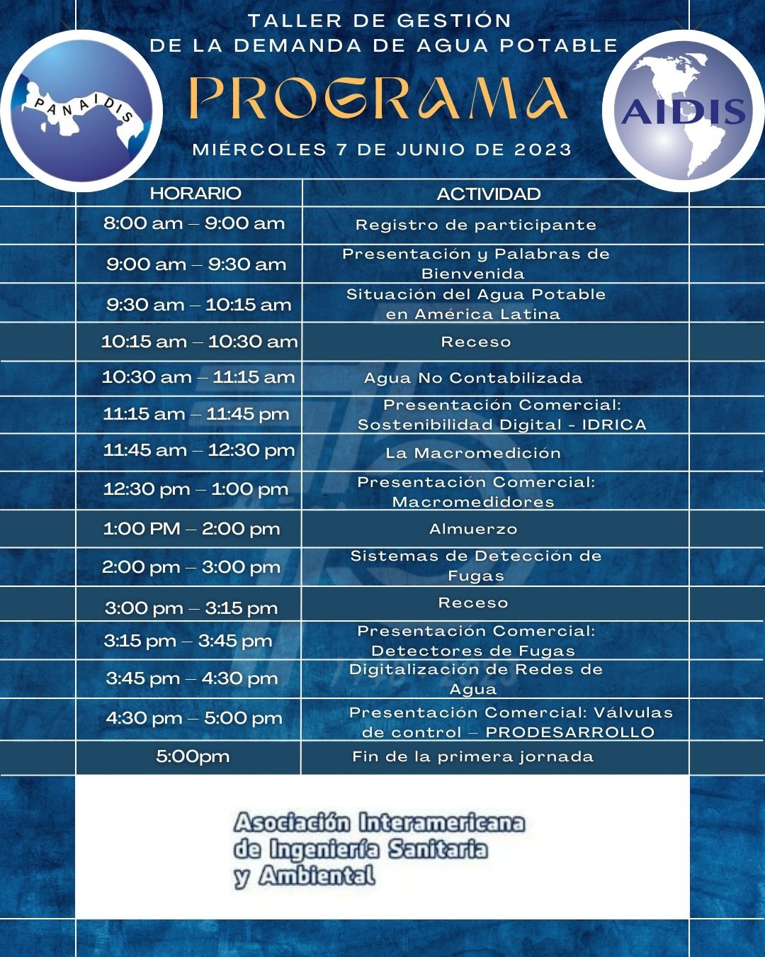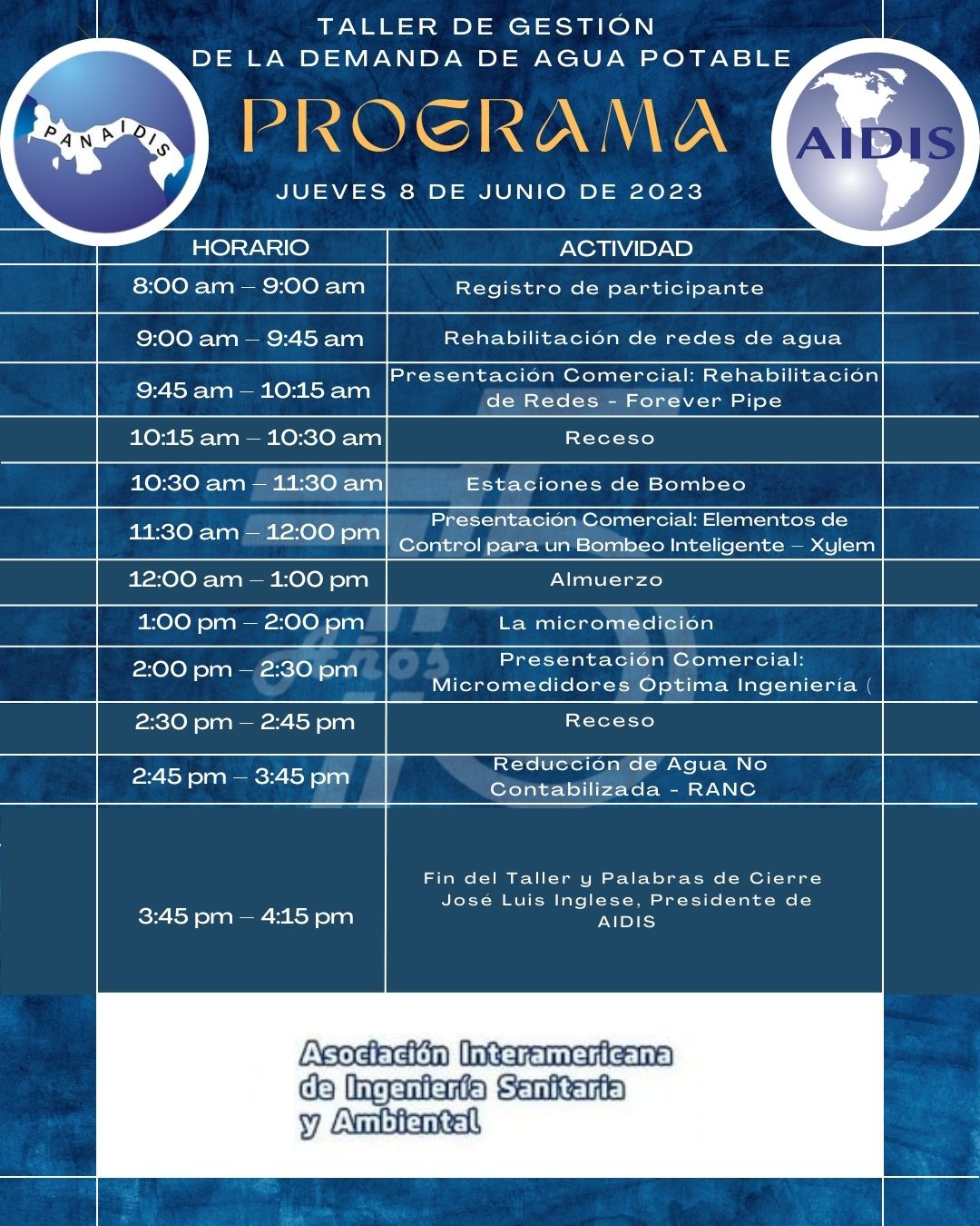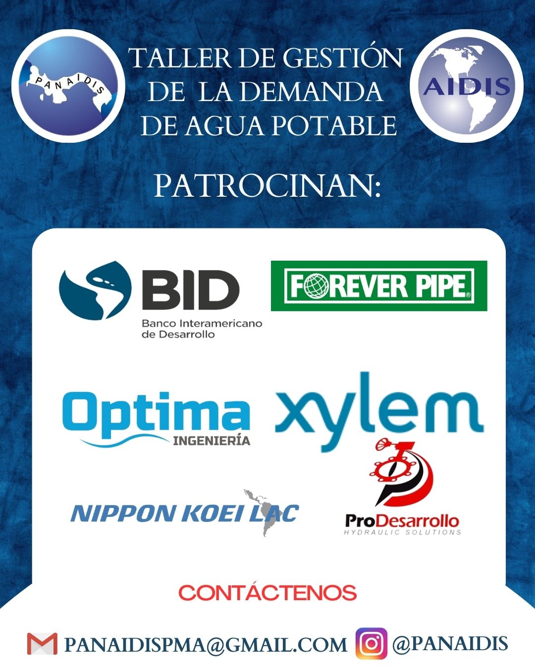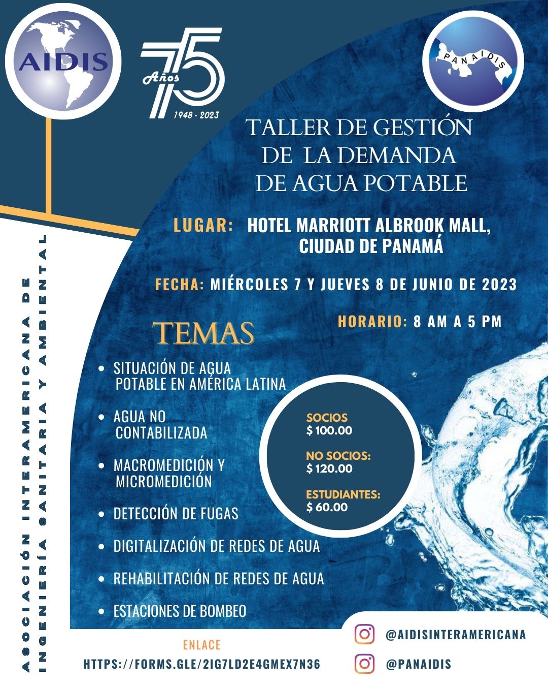La Asociación Interamericana de Ingeniería Sanitaria y Ambiental (AIDIS) a través de su capítulo local PANAIDIS, les invita a participar del Taller de Gestión de la Demanda de Agua Potable, el miércoles 7 y jueves 8 de junio de 2023 en jornada completa, en el Hotel Marriott Panamá Albrook Mall.