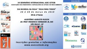 La Asociación de Ingenieros y Especialistas de la CETESB y del Medio Ambiente – ASEC CETESB, promoverá su VII Seminario Internacional ASEC CETESB – Asociación de Ingenieros y Especialista de la CETESB y del Medio Ambiente – Día Mundial del Agua – «Agua para Todos». el 28 de marzo de 2019 en el Auditorio Augusto Ruschi – Av. Profesor Frederico Hermann Jr., 345 – São Paulo, SP.