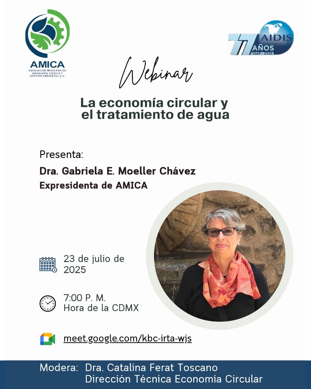 Contaremos con la participación de la Dra. Gabriela E. Moeller Chávez, expresidente de AMICA y reconocida experta en temas ambientales, quien compartirá su visión sobre cómo la economía circular puede transformar el tratamiento del agua y aportar soluciones concretas a los desafíos actuales.