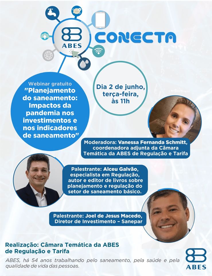#ABESConecta: Dia 02 de junio, 11h, nuestro webinar discutirá las revisiones de planes de inversión en saneamiento, planes municipales de saneamiento y los impactos regulatorios en contratos de prestación de servicios.