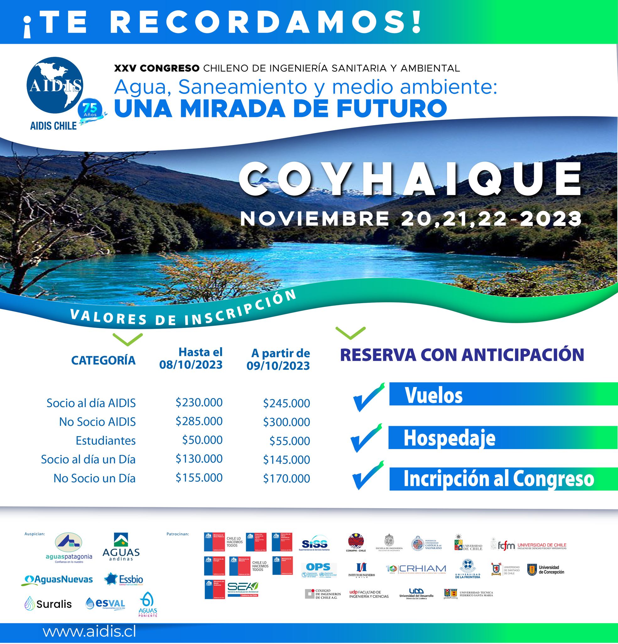 Entre los días 20 y 22 de noviembre del presente año, el Capítulo Chileno de la Asociación Interamericana de Ingeniería Sanitaria y Ambiental, AIDIS Chile, realizará en la ciudad de 𝗖𝗢𝗬𝗛𝗔𝗜𝗤𝗨𝗘, el 𝗫𝗫𝗩 𝗖𝗢𝗡𝗚𝗥𝗘𝗦𝗢 𝗖𝗛𝗜𝗟𝗘𝗡𝗢 𝗗𝗘 𝗜𝗡𝗚𝗘𝗡𝗜𝗘𝗥𝗜́𝗔 𝗦𝗔𝗡𝗜𝗧𝗔𝗥𝗜𝗔 𝗬 𝗔𝗠𝗕𝗜𝗘𝗡𝗧𝗔𝗟, siendo su tema central “Agua, saneamiento y medio ambiente. UNA MIRADA DE FUTURO”.